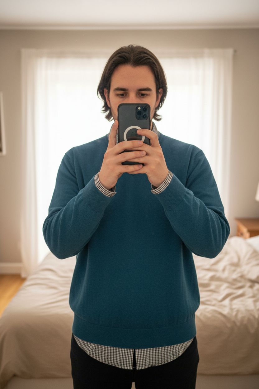 Autograph teal V-neck jumper XXL men smart casual layered look office workwear standing straight facing the camera, in a softly lit bedroom setting, with gentle natural light filtering through a window.