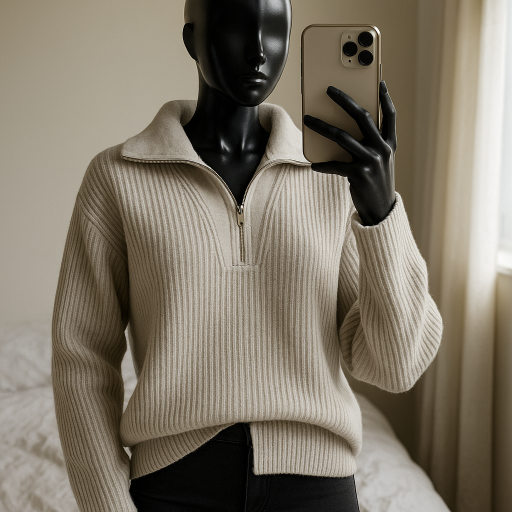 a glossy black plastic mannequin with no facial features in Béžový kardigán so zipsom standing straight facing the camera, with a slim body type, in a softly lit bedroom setting, with gentle natural light filtering through a window.