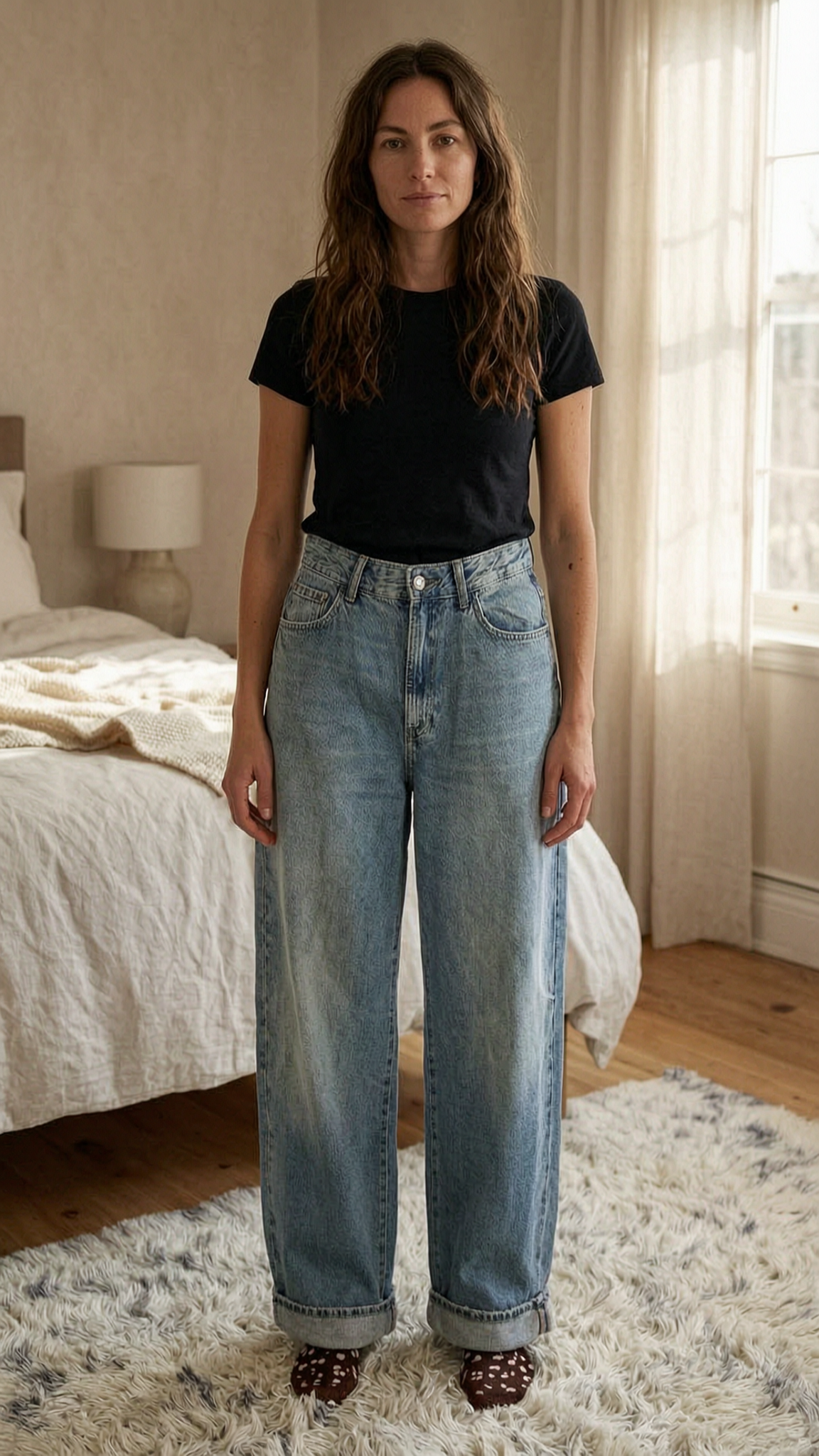 bő szárú farmer standing straight facing the camera, in a softly lit bedroom setting, with gentle natural light filtering through a window.