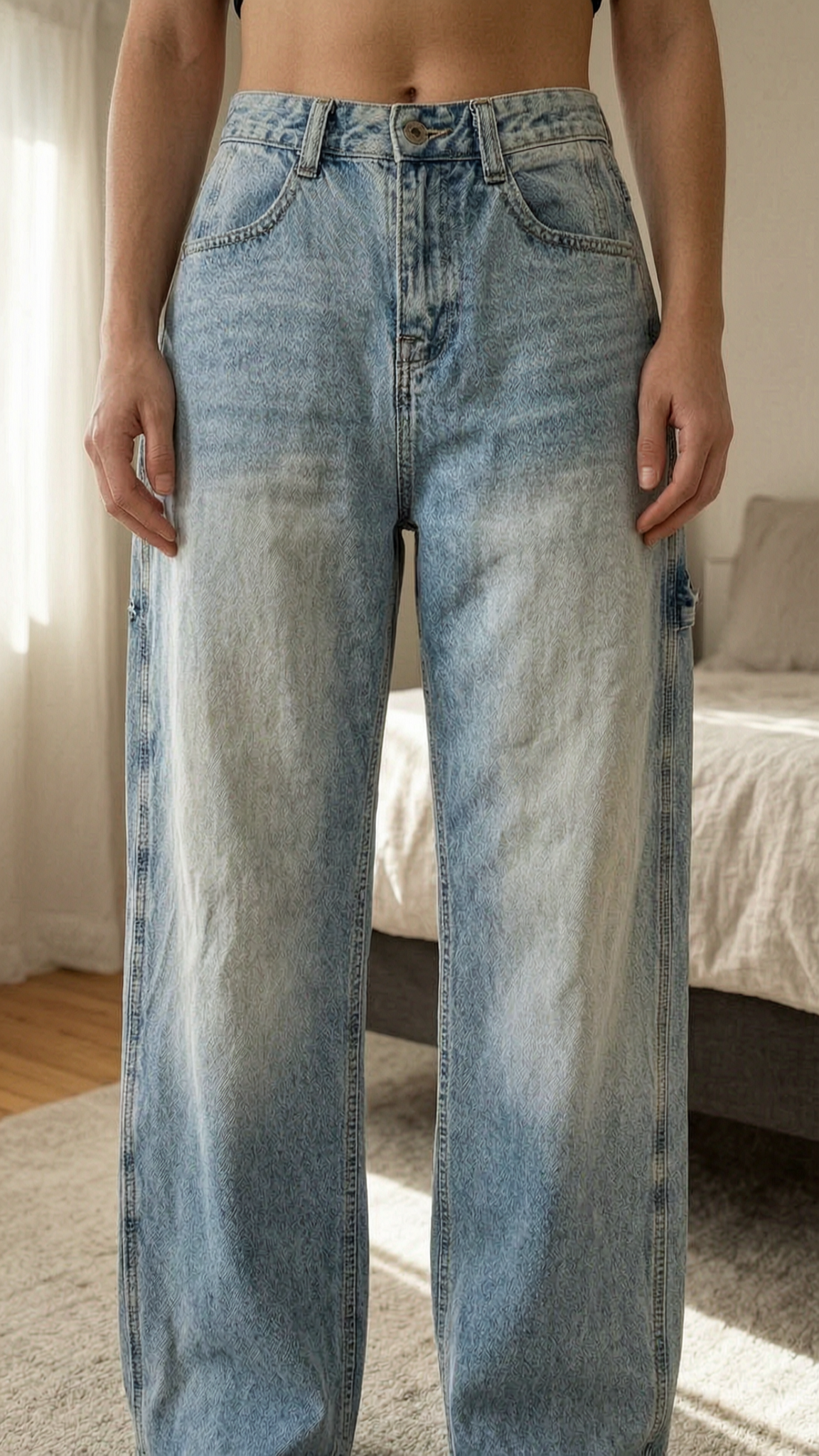 baggy farmer nadrág standing straight facing the camera, in a softly lit bedroom setting, with gentle natural light filtering through a window.