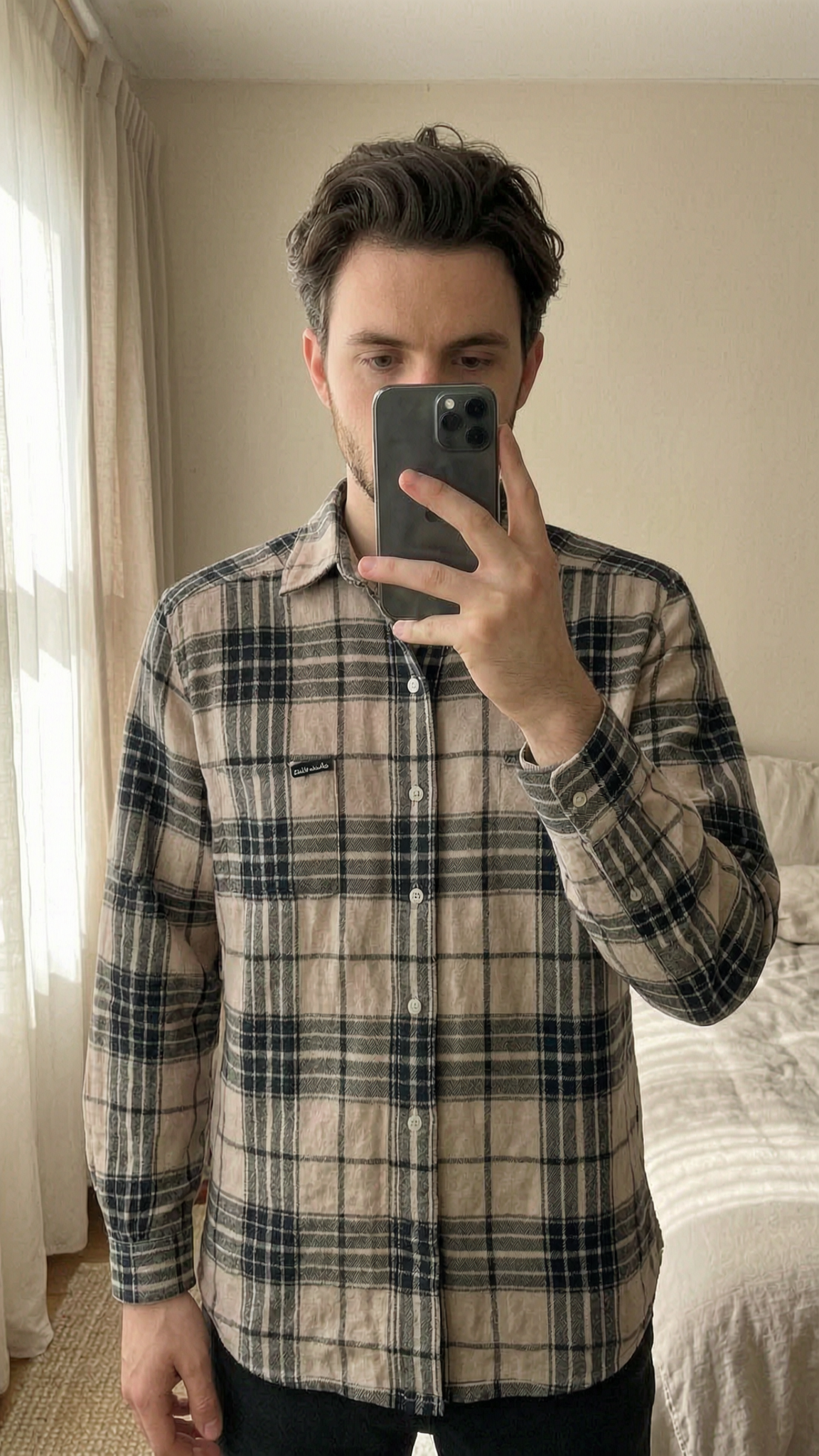 Barbour Vintage Nude and Black Men’s Check Shacket XXL standing straight facing the camera, in a softly lit bedroom setting, with gentle natural light filtering through a window.