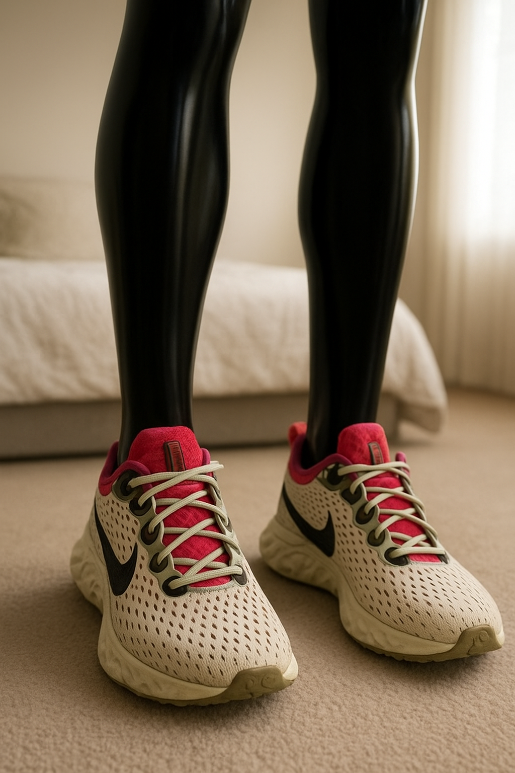 un mannequin noir brillant en plastique, sans traits du visage en Basket Nike react debout, face à la caméra, dans une chambre à la lumière douce, avec une lumière naturelle filtrant par la fenêtre.
