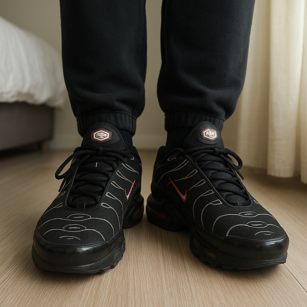 Baskets Nike Air Max Plus noires 👟 debout, face à la caméra, dans une chambre à la lumière douce, avec une lumière naturelle filtrant par la fenêtre.