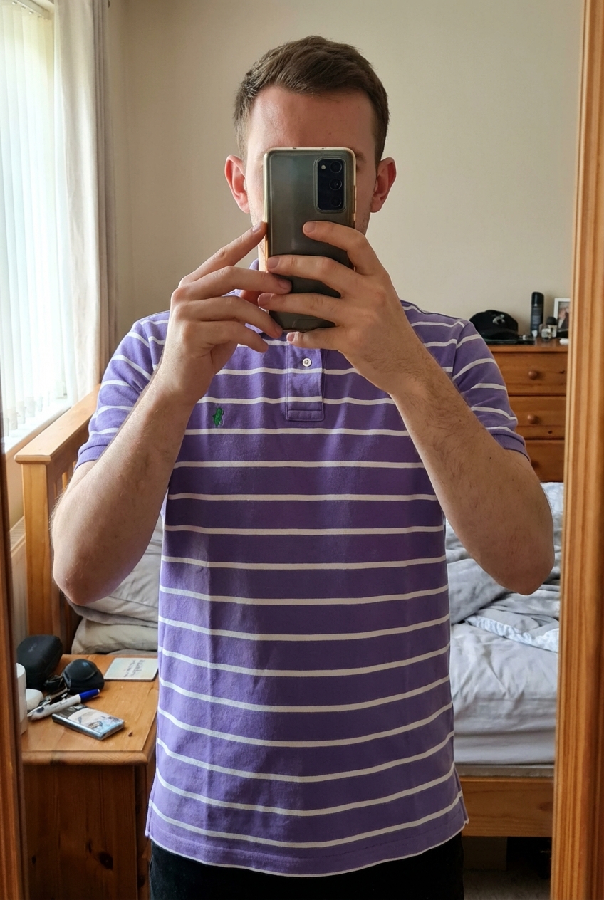 beau polo Ralph Lauren, violet rayures blanches, S debout, face à la caméra, dans une chambre à la lumière douce, avec une lumière naturelle filtrant par la fenêtre.