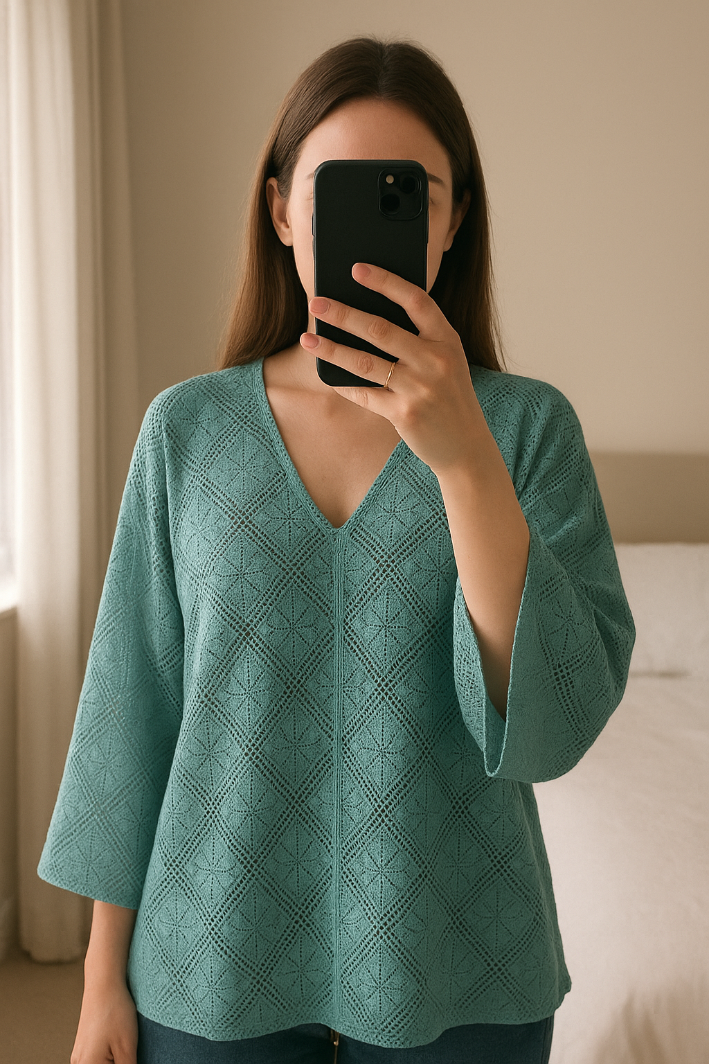 Beautiful Next M oversized cardigan petrol blue/green standing straight facing the camera, in a softly lit bedroom setting, with gentle natural light filtering through a window.