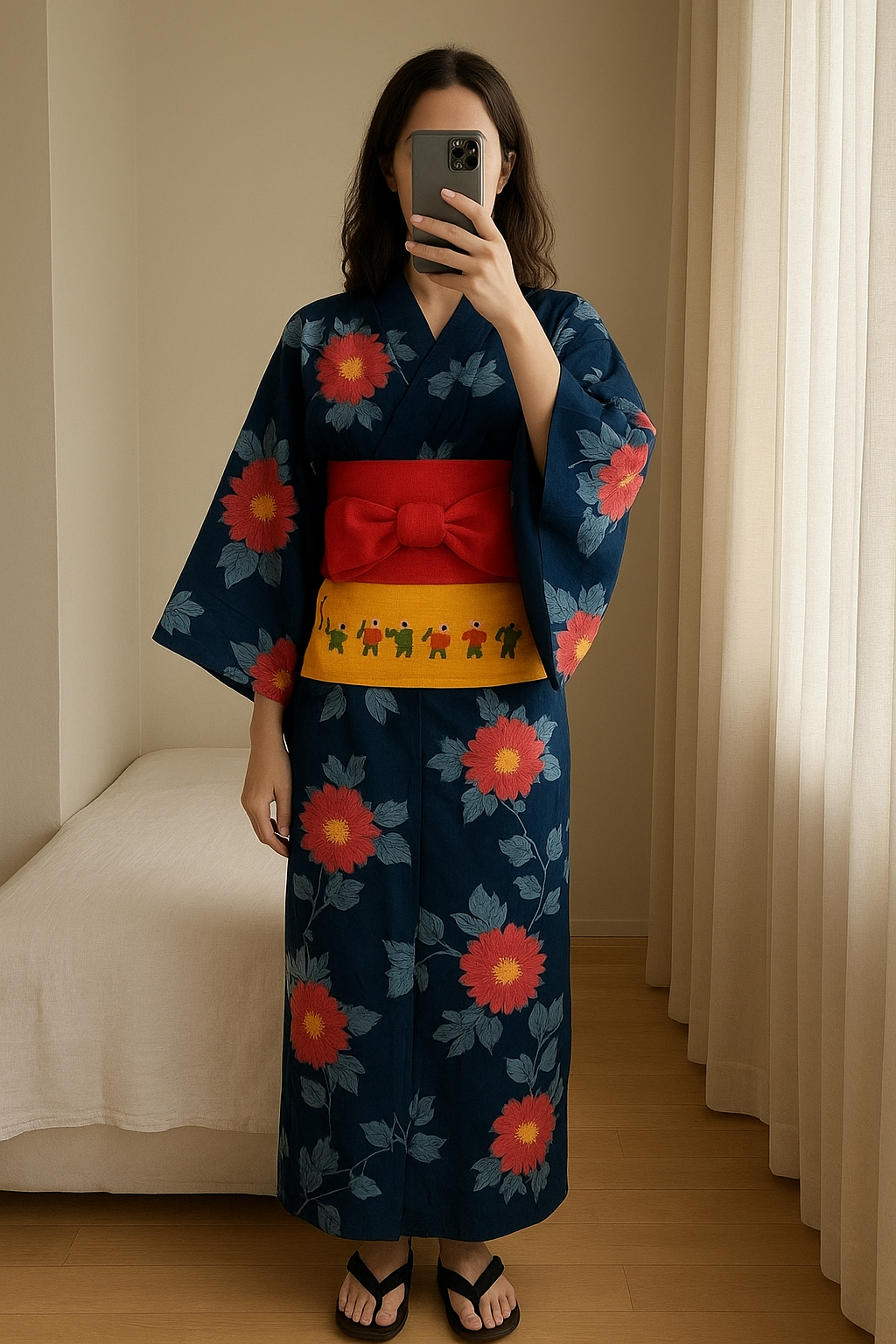 Beautiful Traditional Japanese Kimono sets X 2 with belts, shoes and bow standing straight facing the camera, in a softly lit bedroom setting, with gentle natural light filtering through a window.
