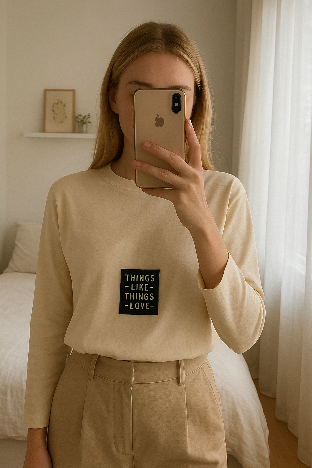 Beige blazer standing straight facing the camera, in a softly lit bedroom setting, with gentle natural light filtering through a window.