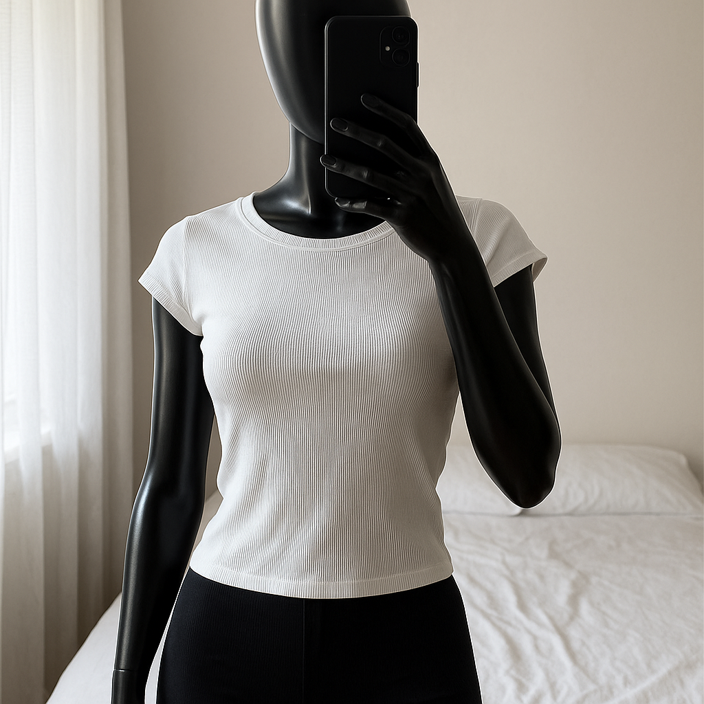 a glossy black plastic mannequin with no facial features in Biely a čierny top Stradivarius standing straight facing the camera, with a slim body type, in a softly lit bedroom setting, with gentle natural light filtering through a window.