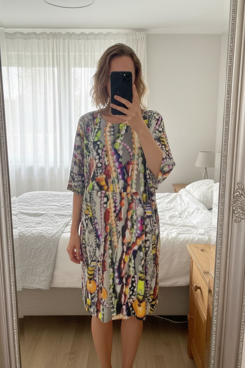 Bitte Kai Rand multicolour abstract art dress UK M EU 38 designer relaxed fit standing straight facing the camera, in a softly lit bedroom setting, with gentle natural light filtering through a window.