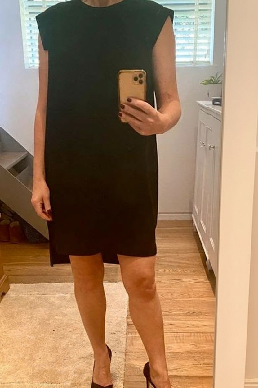 Black AllSaints Tonya Stitch Dress standing straight facing the camera, in a softly lit bedroom setting, with gentle natural light filtering through a window.