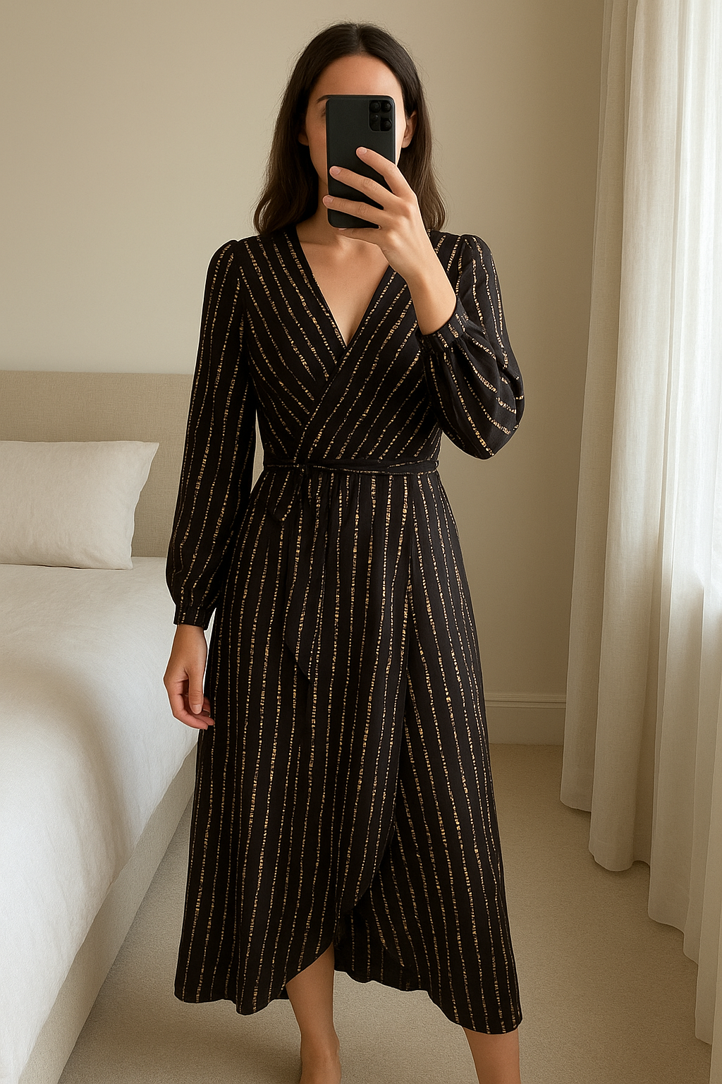 Black and Gold party dress standing straight facing the camera, in a softly lit bedroom setting, with gentle natural light filtering through a window.