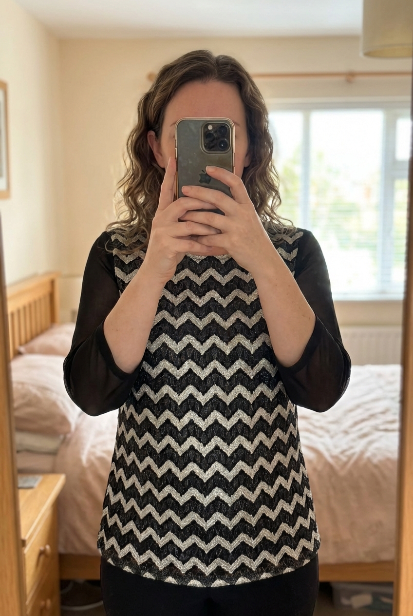Black and grey top standing straight facing the camera, in a softly lit bedroom setting, with gentle natural light filtering through a window.