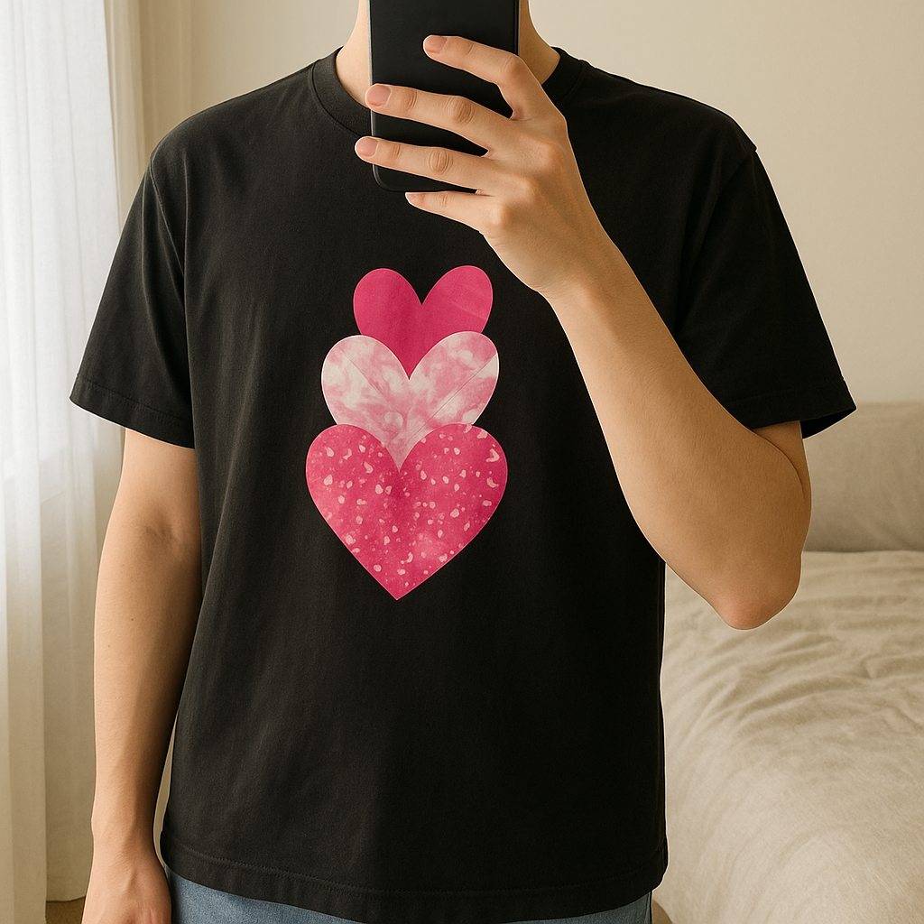 Black and pink heart motif t-shirt size 1XL standing straight facing the camera, in a softly lit bedroom setting, with gentle natural light filtering through a window.