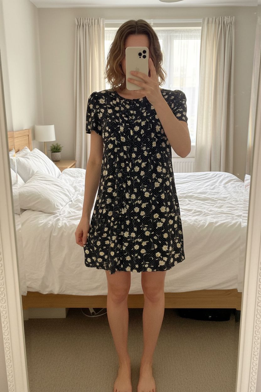 A person in Black Henry Holland Daisy Print Tea Dress Size 8 Button Front Vintage Style standing straight facing the camera, with a slim body type, in a softly lit bedroom setting, with gentle natural light filtering through a window.