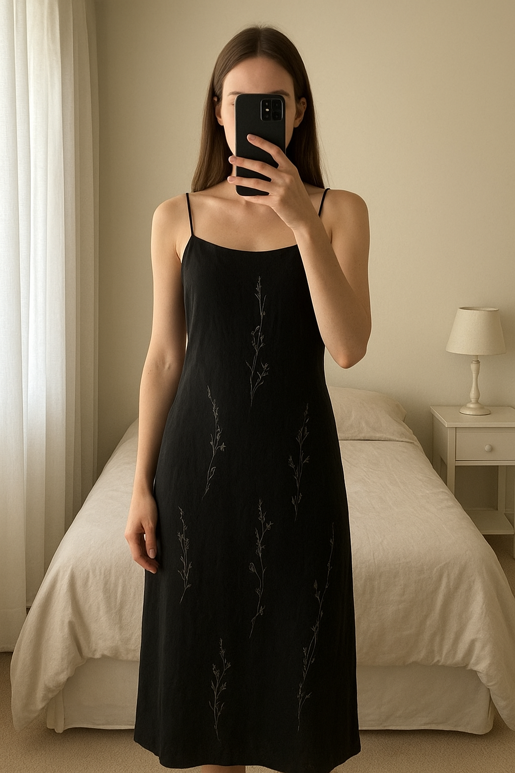 Black midi slip dress size 12 standing straight facing the camera, in a softly lit bedroom setting, with gentle natural light filtering through a window.