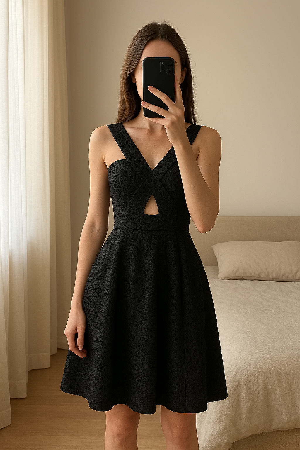Black mini dress size 10 standing straight facing the camera, in a softly lit bedroom setting, with gentle natural light filtering through a window.