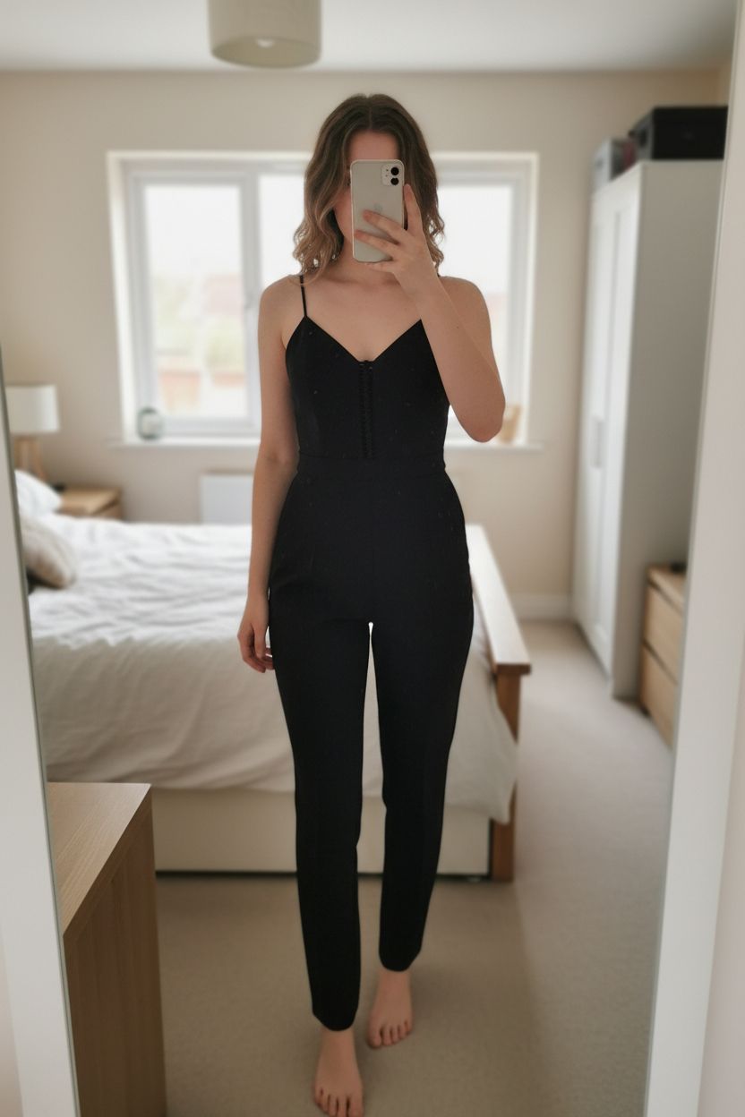 Black Playsuit by Dark Pink standing straight facing the camera, in a softly lit bedroom setting, with gentle natural light filtering through a window.