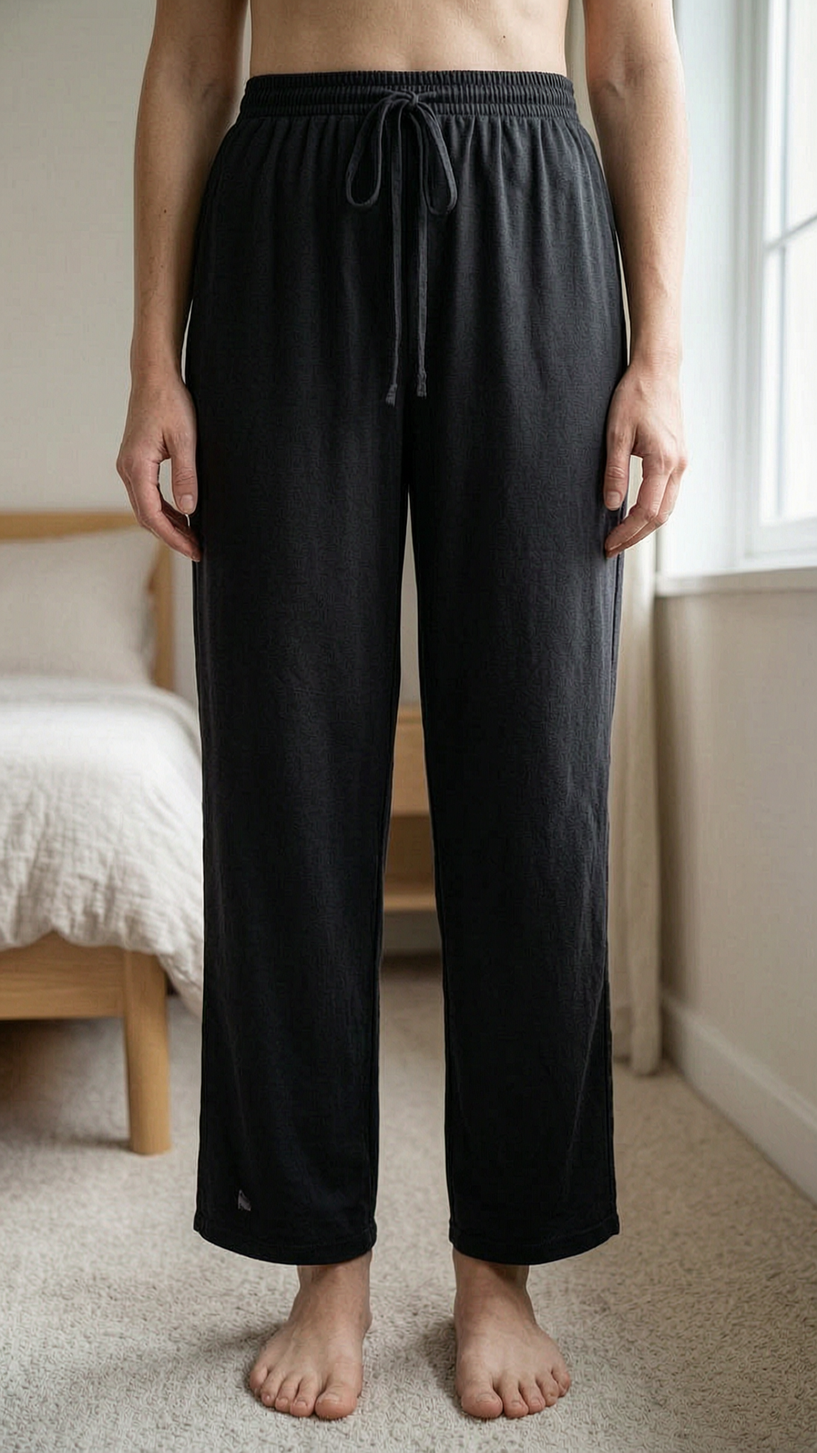 Black size 14/16 trousers, elasticated waist standing straight facing the camera, in a softly lit bedroom setting, with gentle natural light filtering through a window.