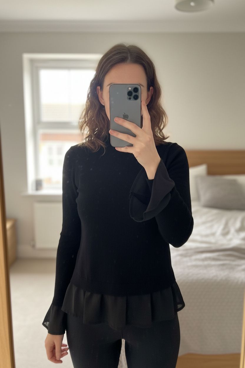 Black turtle neck top by Lipsy standing straight facing the camera, in a softly lit bedroom setting, with gentle natural light filtering through a window.