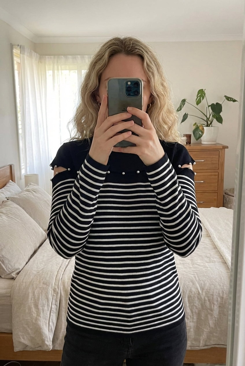 Black white stripes wool sweater w pearl details Sz 2 Claudie Pierlot debout, face à la caméra, dans une chambre à la lumière douce, avec une lumière naturelle filtrant par la fenêtre.