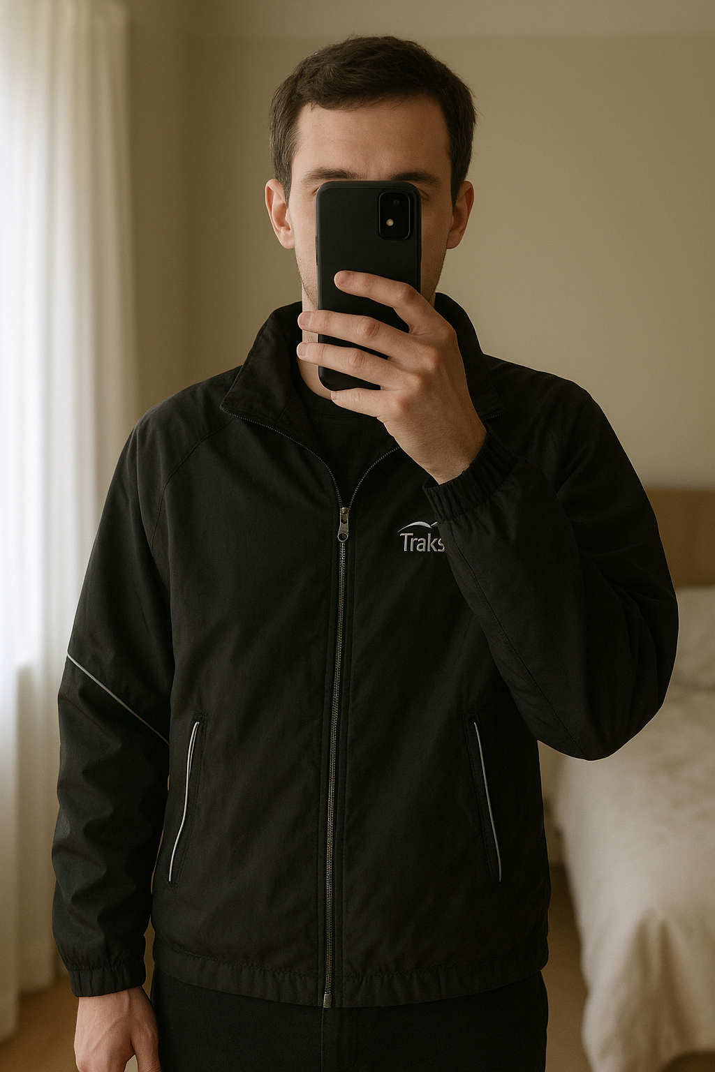 Black Zip-Up Jacket by Traks – Size 12 standing straight facing the camera, in a softly lit bedroom setting, with gentle natural light filtering through a window.