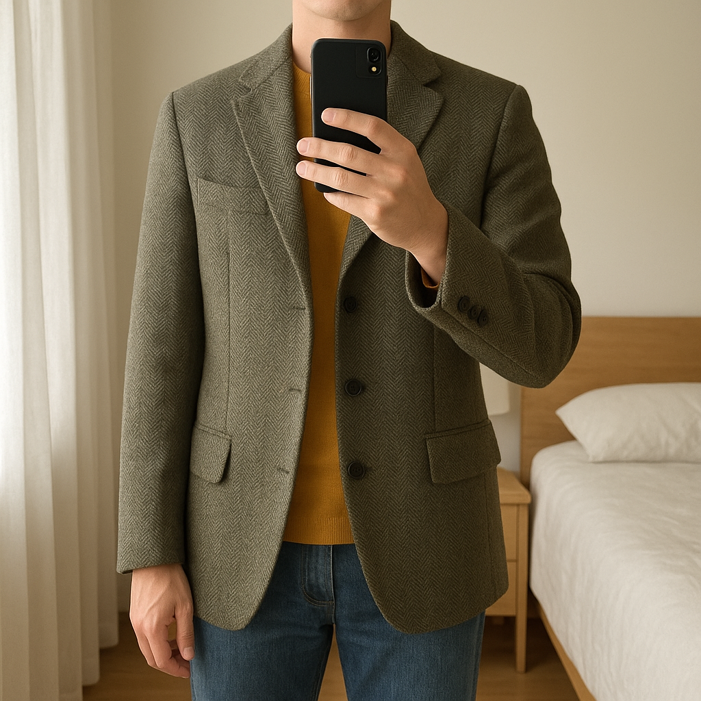 Bladen Supasax Vintage Tweed 100% Wool Hacking Hunting Jacket - 40S standing straight facing the camera, in a softly lit bedroom setting, with gentle natural light filtering through a window.