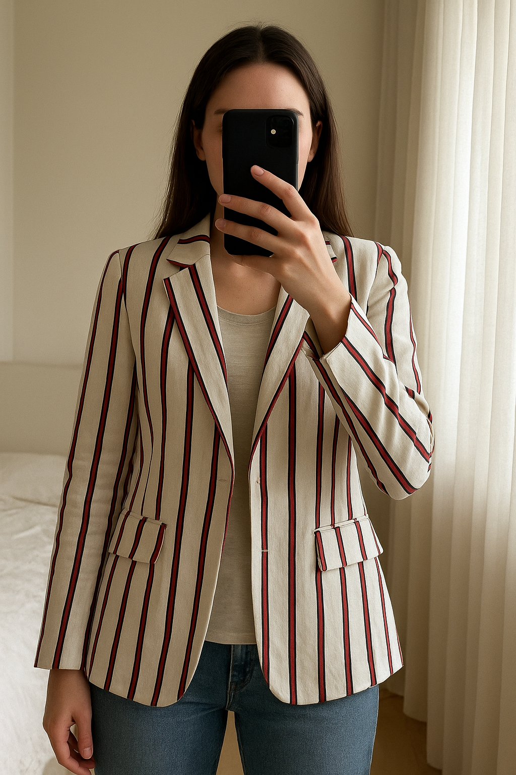 Blazer donna stupendo misura M in piedi, rivolto verso la fotocamera, in una camera da letto con luce soffusa e luce naturale che filtra dalla finestra.