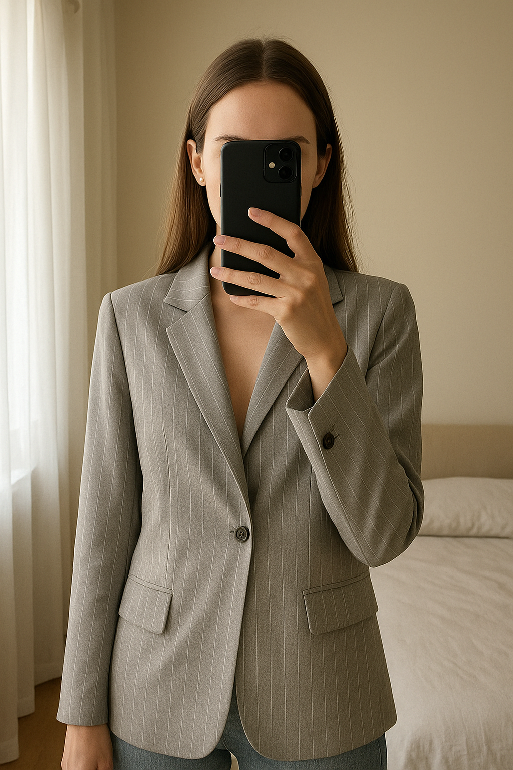 Blazer gris Stradivarius – Taille L debout, face à la caméra, dans une chambre à la lumière douce, avec une lumière naturelle filtrant par la fenêtre.