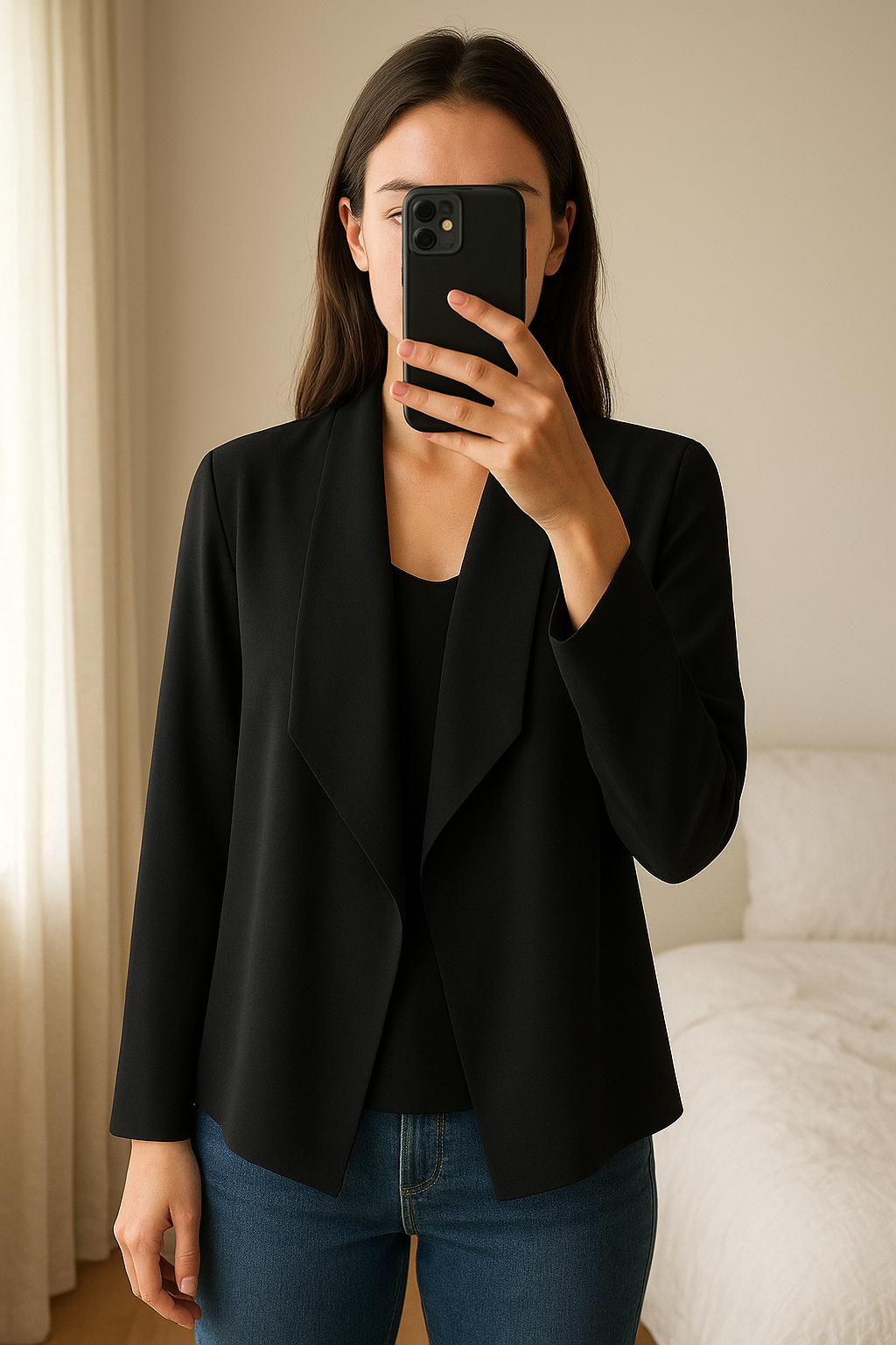 Blazer nero taglia unica in piedi, rivolto verso la fotocamera, in una camera da letto con luce soffusa e luce naturale che filtra dalla finestra.