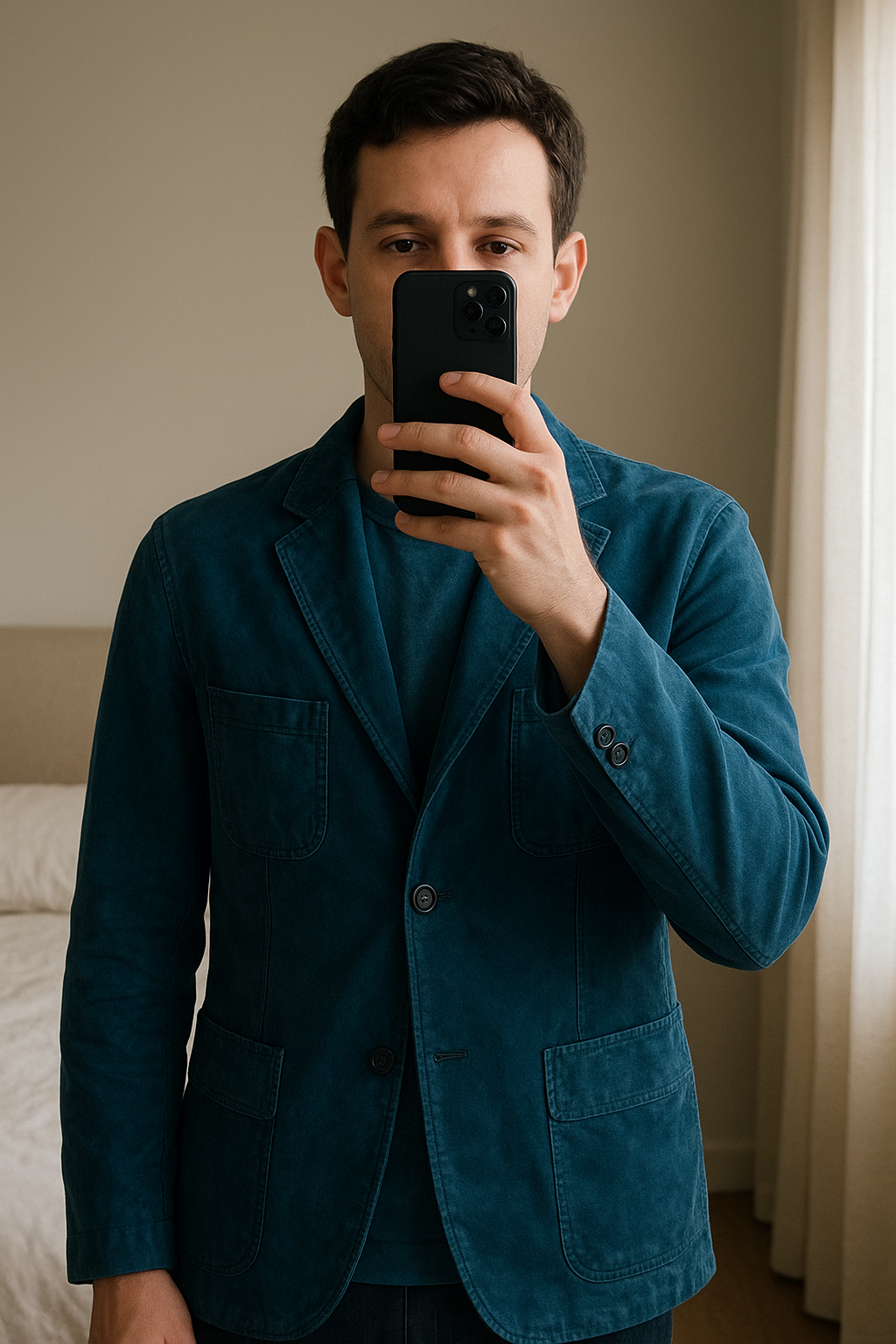 Une personne en Blazer neuf Zegna debout, face à la caméra, dans une chambre à la lumière douce, avec une lumière naturelle filtrant par la fenêtre.
