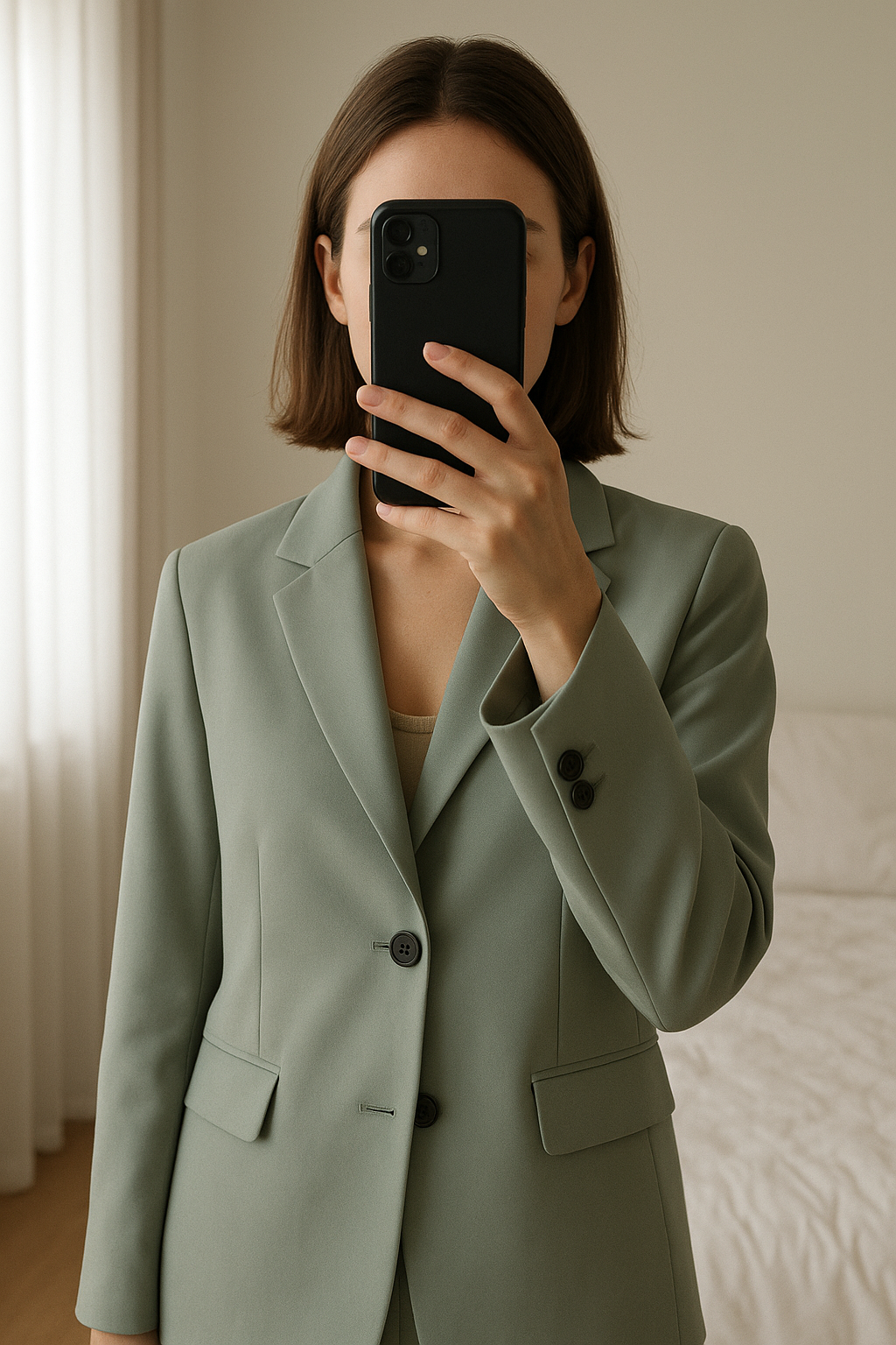 Blazer vert d’eau debout, face à la caméra, dans une chambre à la lumière douce, avec une lumière naturelle filtrant par la fenêtre.