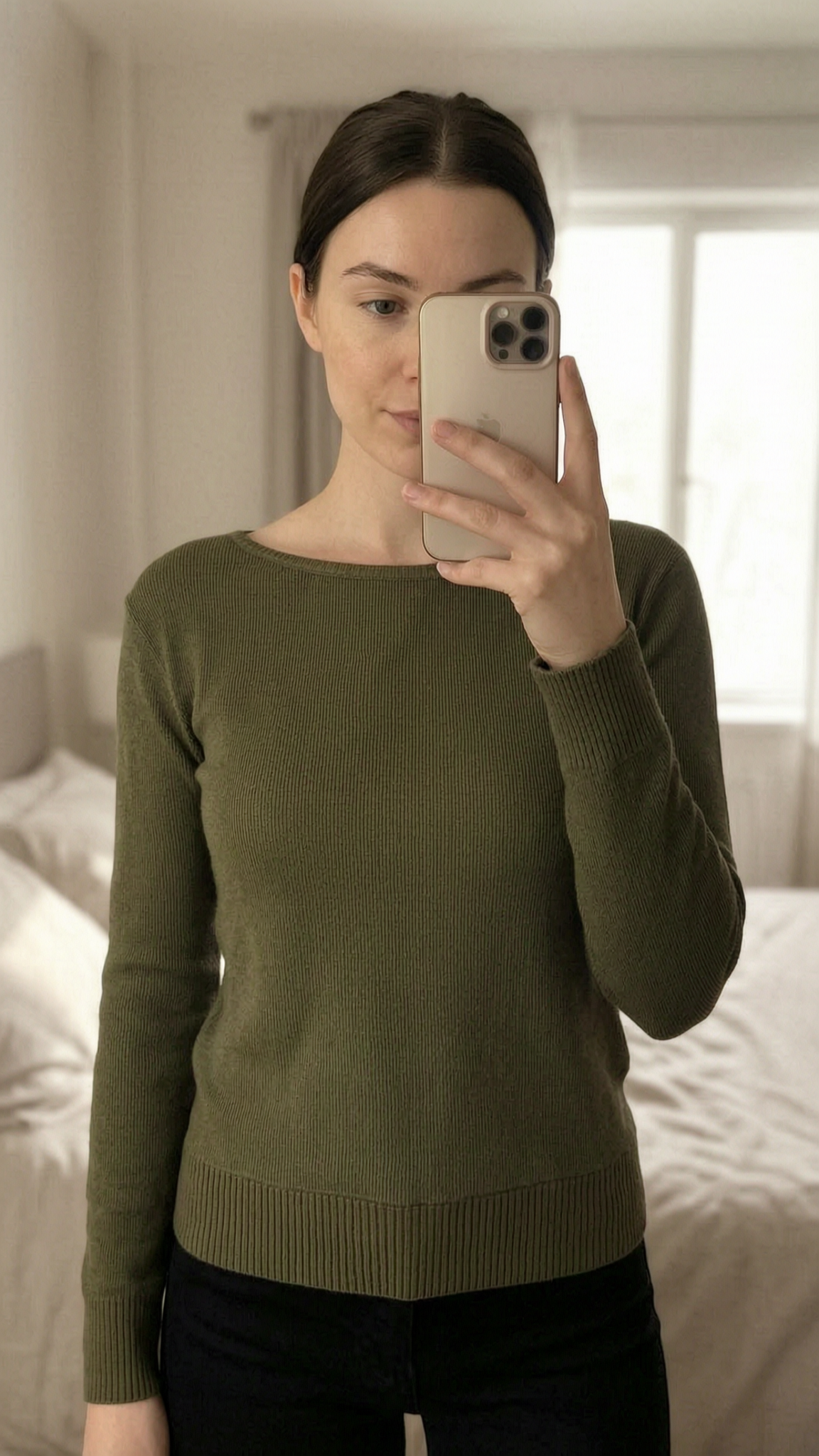 BLFD Khaki Green Ribbed Knit Jumper Size S (UK 8) standing straight facing the camera, in a softly lit bedroom setting, with gentle natural light filtering through a window.