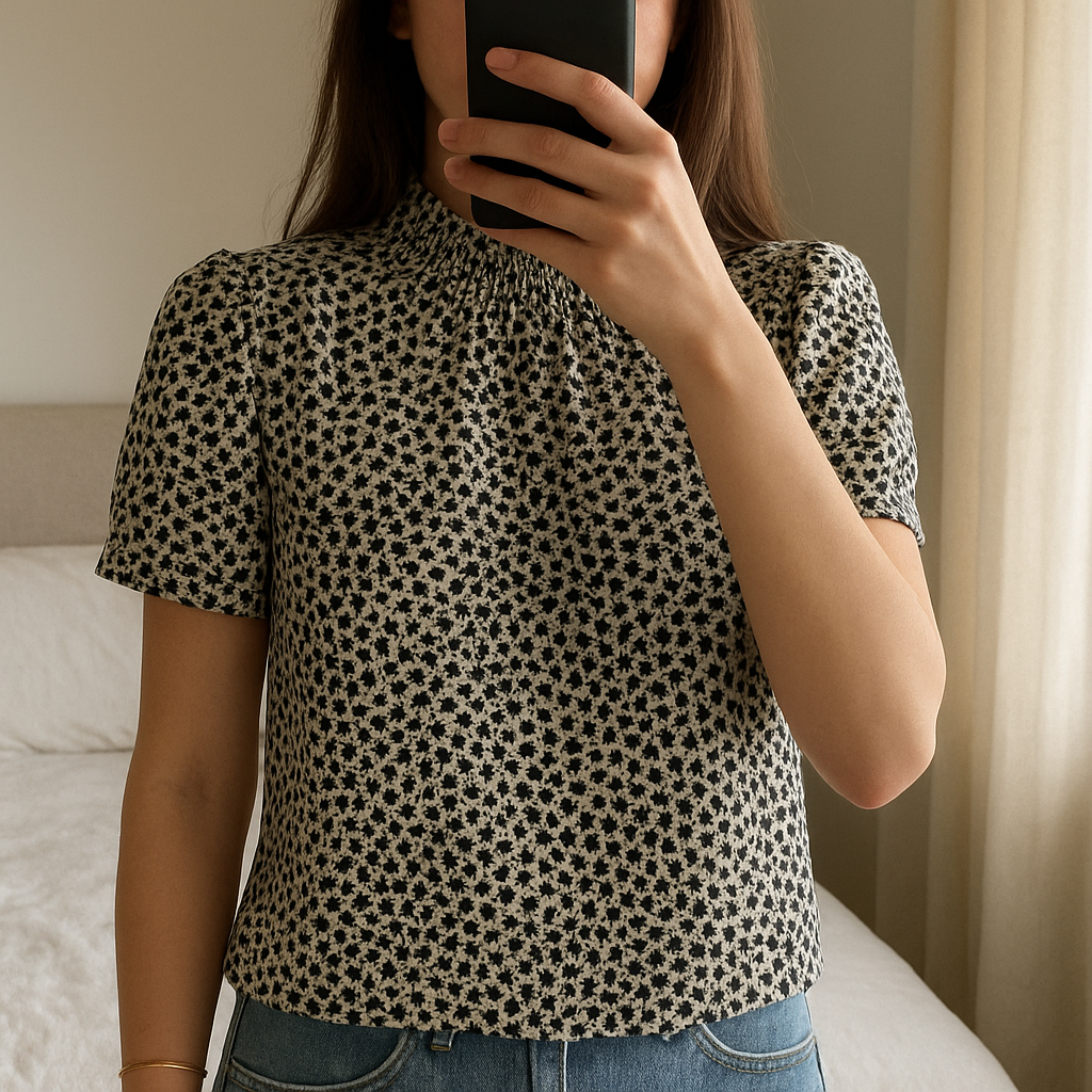 Blouse imprimée léopard col smocké - Zara debout, face à la caméra, dans une chambre à la lumière douce, avec une lumière naturelle filtrant par la fenêtre.