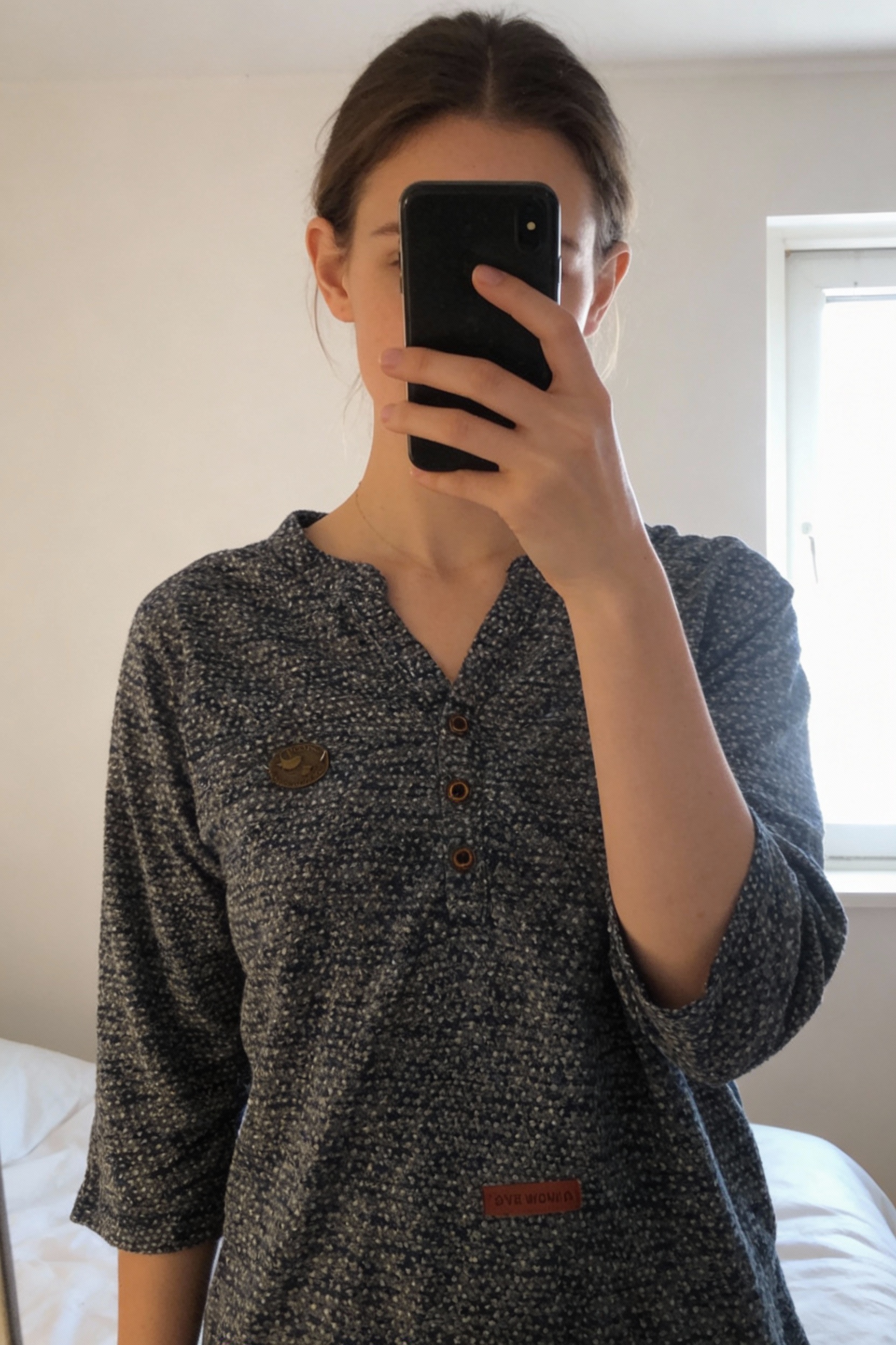 Blouse Naketano L bleu debout, face à la caméra, dans une chambre à la lumière douce, avec une lumière naturelle filtrant par la fenêtre.