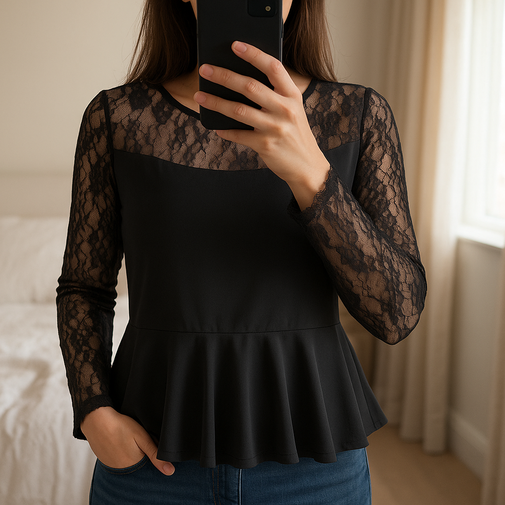 Blouse Peplum debout, face à la caméra, dans une chambre à la lumière douce, avec une lumière naturelle filtrant par la fenêtre.