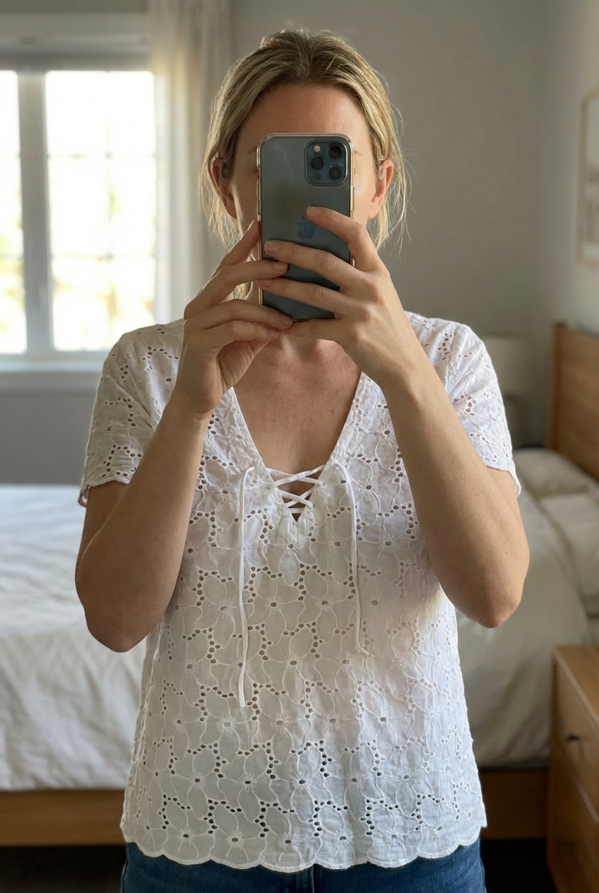 Blouse Sézane 42 debout, face à la caméra, dans une chambre à la lumière douce, avec une lumière naturelle filtrant par la fenêtre.