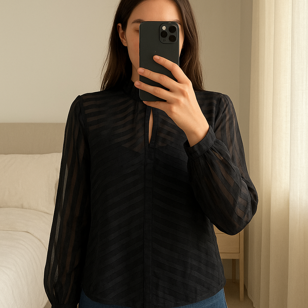 Blouse transparente noire à rayures – Taille M debout, face à la caméra, dans une chambre à la lumière douce, avec une lumière naturelle filtrant par la fenêtre.