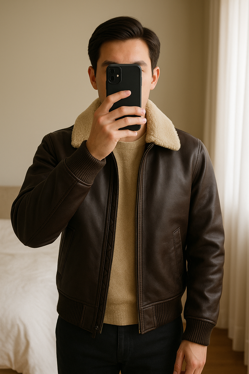 Blouson aviateur col sherpa debout, face à la caméra, dans une chambre à la lumière douce, avec une lumière naturelle filtrant par la fenêtre.