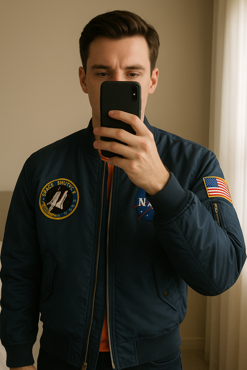 Une personne en Blouson Aviateur Us. Assn debout, face à la caméra, dans une chambre à la lumière douce, avec une lumière naturelle filtrant par la fenêtre.