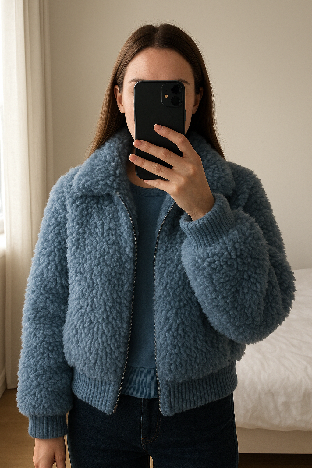 Blouson bleu jean Fausse Fourrure debout, face à la caméra, dans une chambre à la lumière douce, avec une lumière naturelle filtrant par la fenêtre.