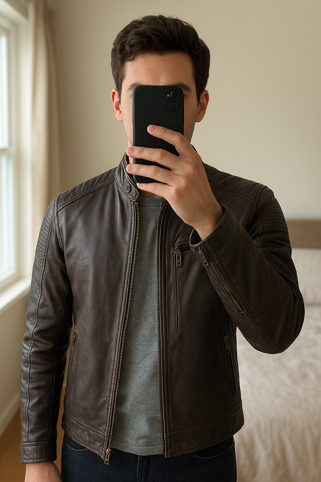 Blouson cuir chevignon debout, face à la caméra, dans une chambre à la lumière douce, avec une lumière naturelle filtrant par la fenêtre.