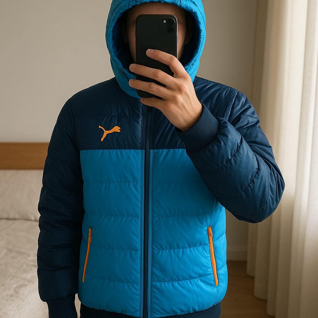 Blouson Puma bleu debout, face à la caméra, dans une chambre à la lumière douce, avec une lumière naturelle filtrant par la fenêtre.