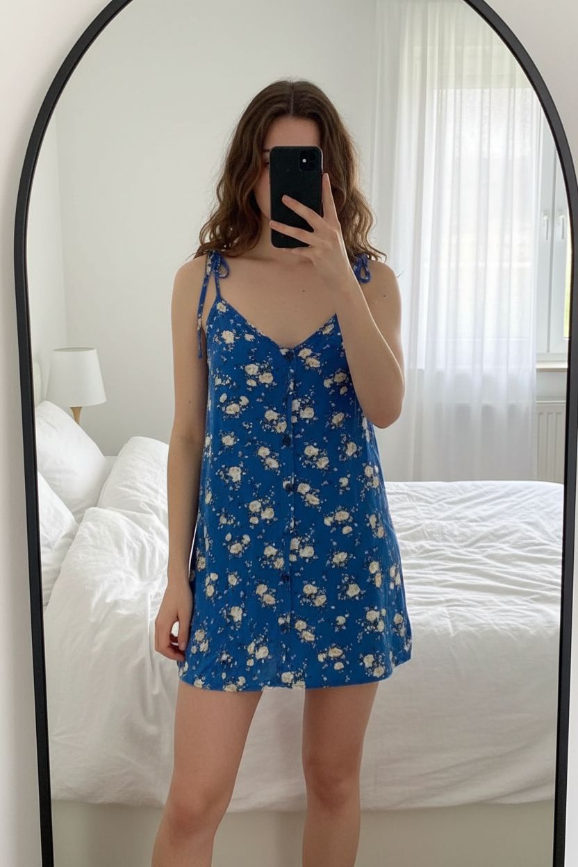 A person in BLue ditsy coral slip cami dress 90s y2k Motel standing straight facing the camera, with a slim body type, in a softly lit bedroom setting, with gentle natural light filtering through a window.