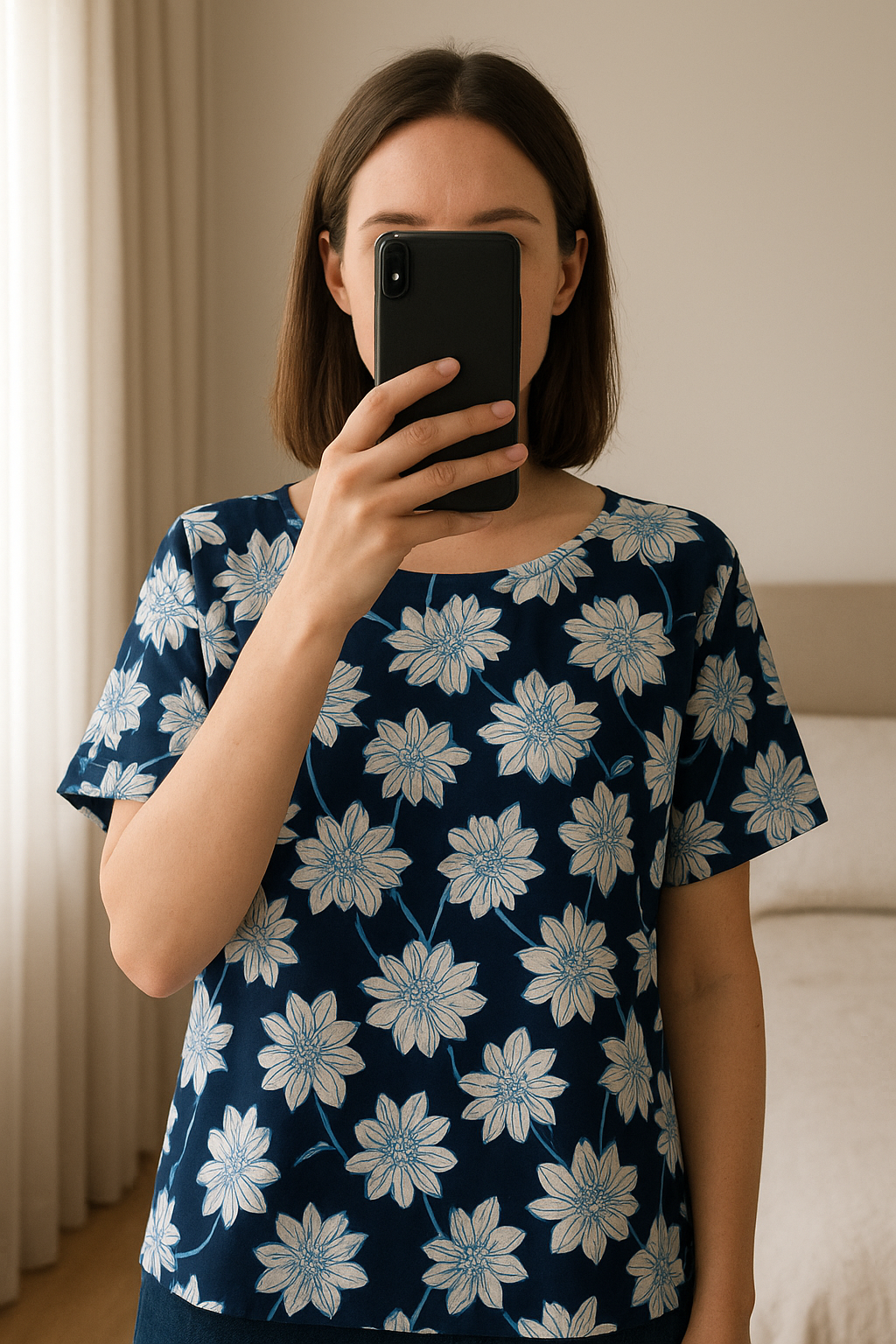 Blue floral blouse standing straight facing the camera, in a softly lit bedroom setting, with gentle natural light filtering through a window.