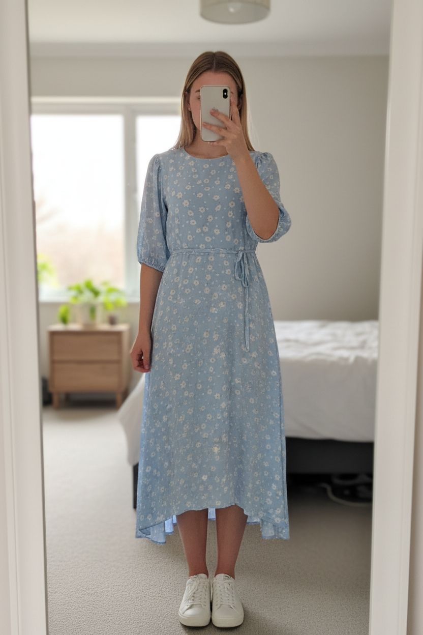 Blue floral midi tea dress standing straight facing the camera, in a softly lit bedroom setting, with gentle natural light filtering through a window.