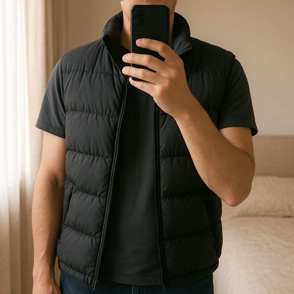 Blue inc padded mens gillet standing straight facing the camera, in a softly lit bedroom setting, with gentle natural light filtering through a window.