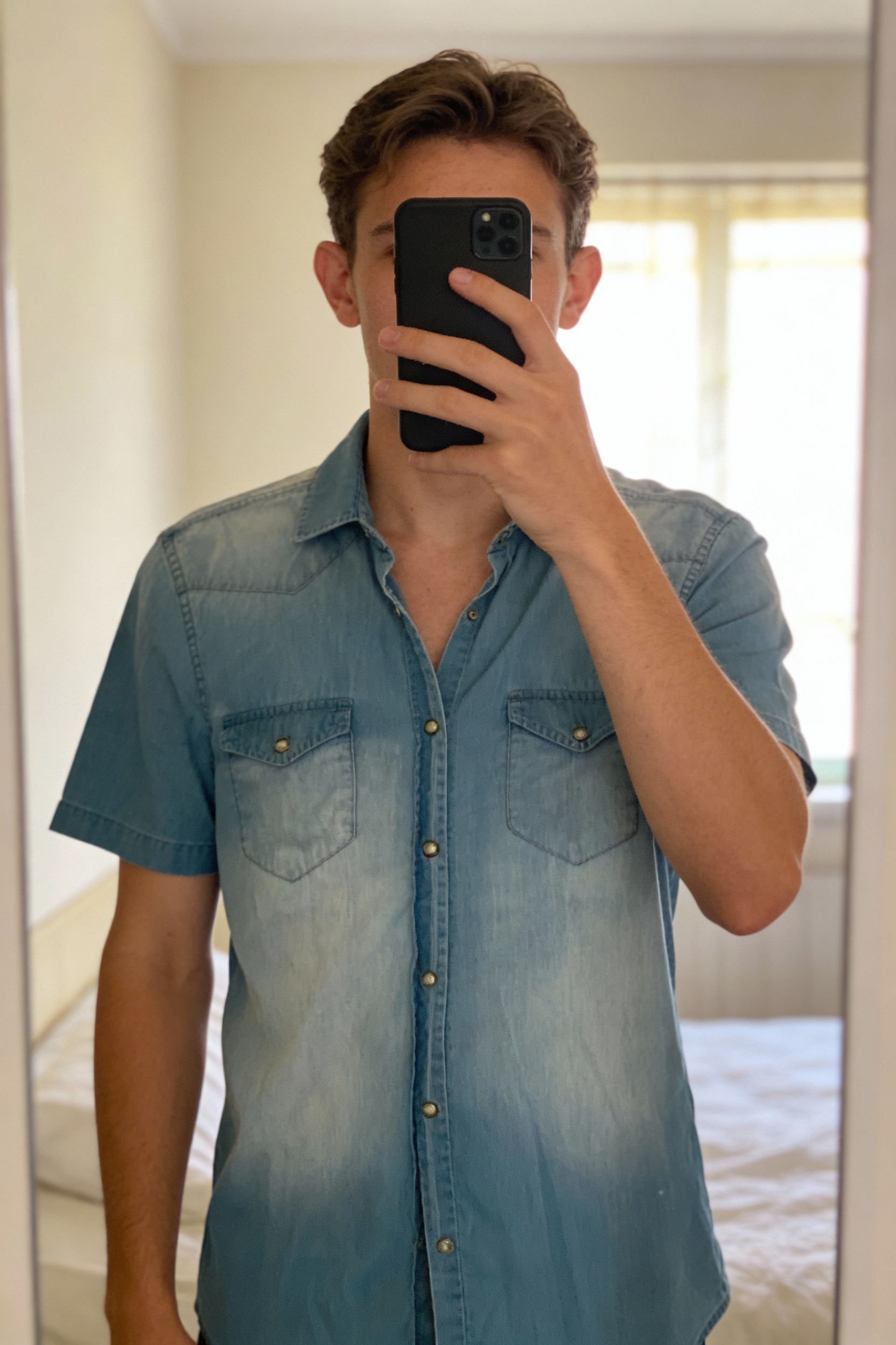 Blue shirt standing straight facing the camera, in a softly lit bedroom setting, with gentle natural light filtering through a window.