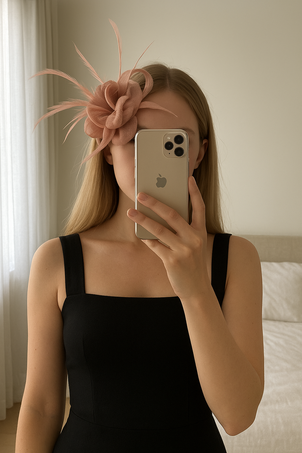 Blush Pink Fascinator Pink Fascinate standing straight facing the camera, in a softly lit bedroom setting, with gentle natural light filtering through a window.