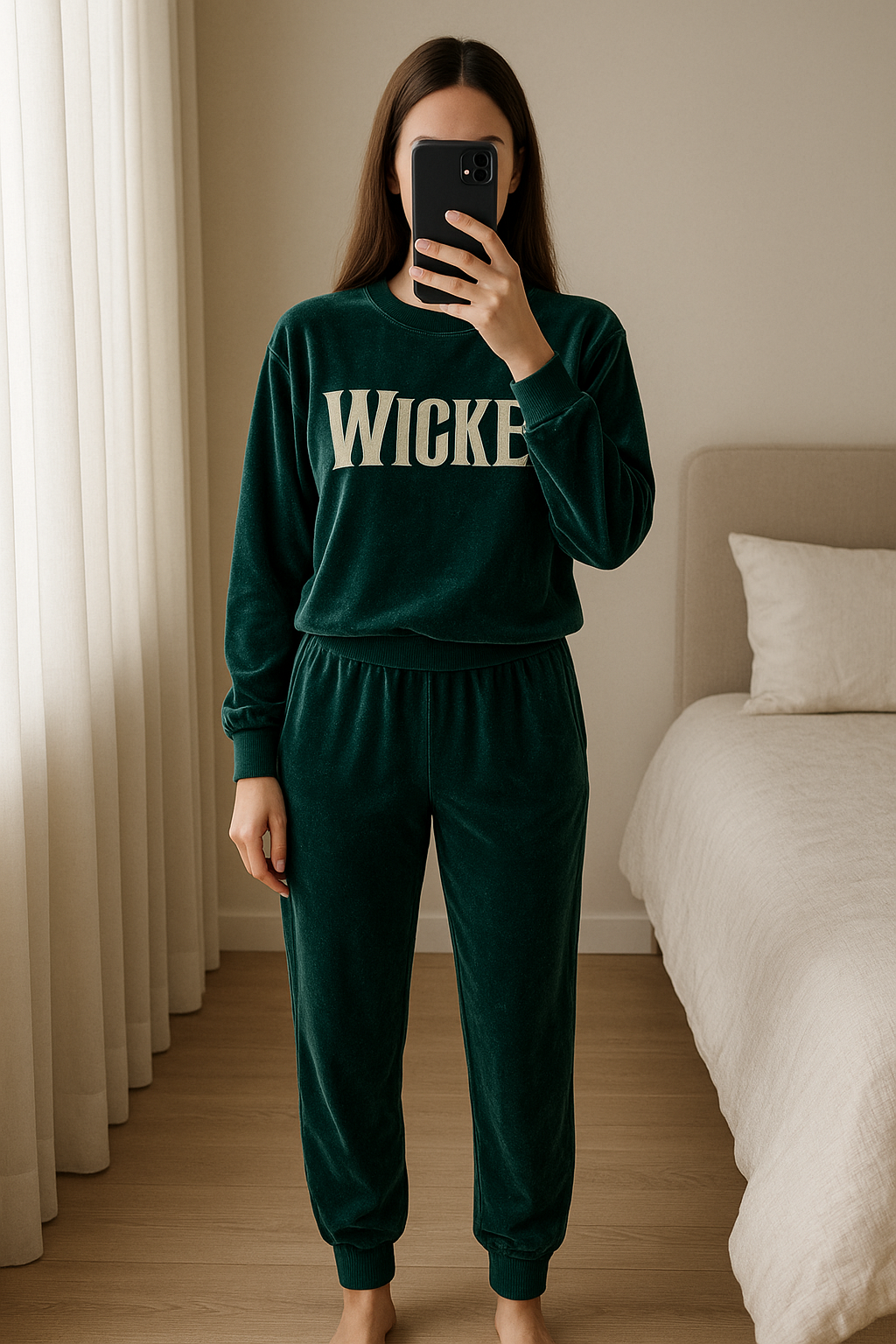 BNWT - Green F&F Wicked Pyjamas, loungewear. New. Top 8-10, Bottoms 12-14 standing straight facing the camera, in a softly lit bedroom setting, with gentle natural light filtering through a window.