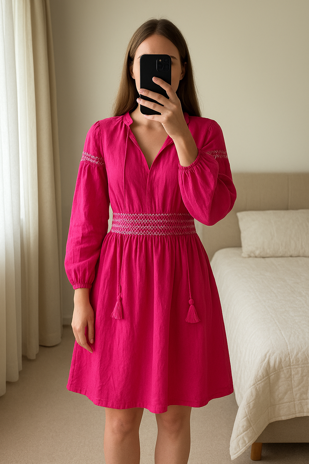 BNWT Hot pink Zara dress. Size M. UK 10 standing straight facing the camera, in a softly lit bedroom setting, with gentle natural light filtering through a window.
